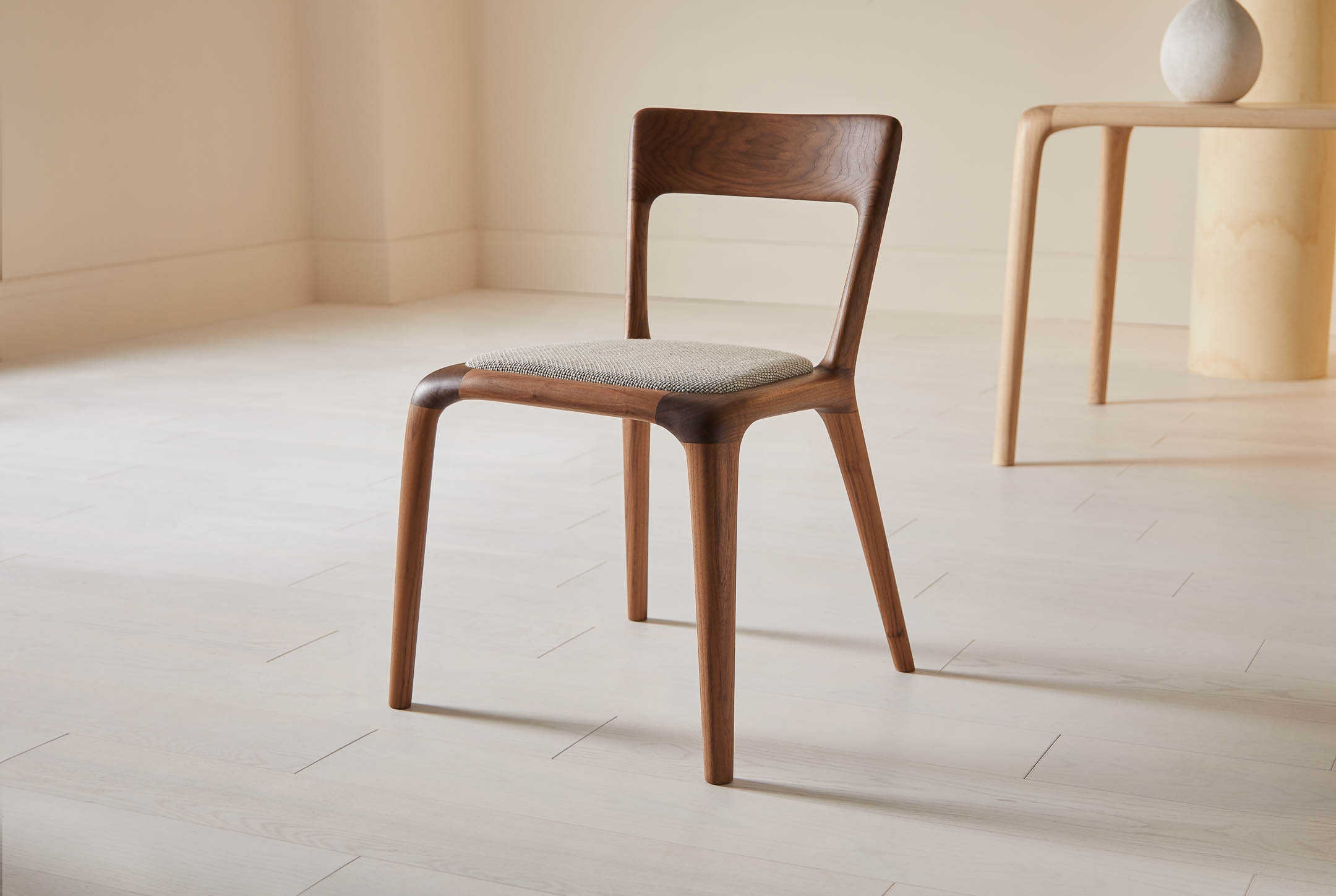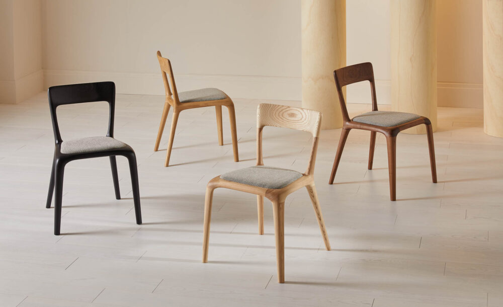 Available in solid oak, walnut, natural ash or ebonised ash, each chair is shaped, assembled and upholstered by hand in our UK workshop. The ergonomic backrest offers natural support, while the upholstered seat brings relaxed comfort to dining, working or social spaces.